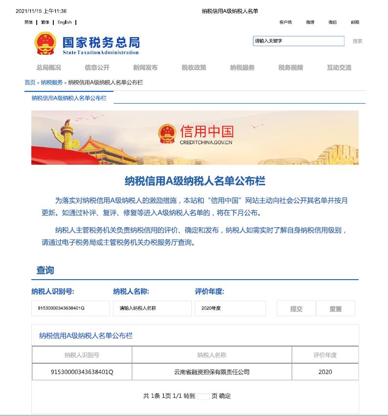 云南省融资担保有限责任公司获评2020年纳税信用A级企业